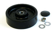 The AT 101/210-1-B-ST steer wheel assembly is designed for Atlas pallet jacks. This assembly includes one steer wheel with a pre-installed bearing, one hub cap, one bushing, and two washers. Its tread is made of ultra-poly for durability and smooth operation. Its nylon hub ensures lightweight strength and resistance to wear. The pre-installed bearing has a 20 mm inner diameter, providing reliable rotation and stability.