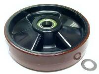 The BT 12358-2 steer wheel assembly fits BT Prime Mover 3000, 5000, 12H, and 20H pallet jacks. It includes one steer wheel with a pre-installed bearing and one washer for easy setup. Its tread is made of polyurethane, offering smooth movement and durability. Its hub is made of nylon, making it strong yet lightweight. With an 8-inch diameter, this steering wheel is built for heavy-duty use and reliable performance.