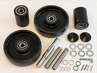 The GWK-ECO-CK load roller assembly includes two load rollers and two steer wheels. Each wheel comes with pre-installed bearings for easy installation. This kit also contains one axle shaft, two load wheel axles, and an axle nut with a bolt. Additional components include two hub caps, two lock rings, four spiral pins, and washers. These load rollers are made from ultra-polyurethane, ensuring durability and smooth performance.