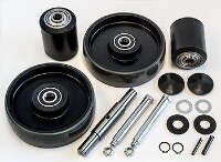 The GWK-LCR-CK steer wheel assembly includes two load wheels and two steer wheels, each equipped with pre-installed bearings for seamless functionality. It also contains an axle shaft, two load wheel axles with pre-fitted bolts and nuts, two hub caps, two spiral pins, two lock rings, and four washers. These wheels are made from ultra-poly material, ensuring high durability and smooth operation.