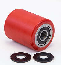 The MU 91619-A-D load roller plays a pivotal role in the functionality of the pallet jack, primarily responsible for supporting and maneuvering loads with ease and stability. Located at the front end of the pallet jack, the load roller assembly consists of a robust load roller equipped with pre-installed bearings and two washers, ensuring smooth operation and reduced friction during load transportation. Crafted from ultra-durable red polyurethane material, it offers exceptional performance, longevity, and resistance to wear and tear.