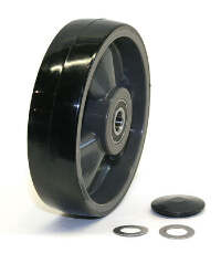 The WE 270135-ST steer wheel assembly facilitates smooth maneuverability and precise steering control. This assembly is located at the rear of the pallet jack. It comprises a robust steer wheel with pre-installed bearings for reduced friction and enhanced movement. Accompanied by a hub cap and two washers, it ensures a secure fit and sustained performance. The steer wheel's design features a polyurethane tread and a nylon hub. This assembly is not only pivotal for the functionality of the pallet jack but also for the safety and efficiency of material handling tasks.